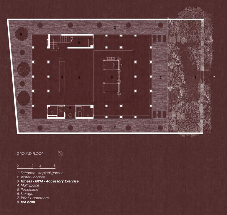 The Red Cave 하우스는 외부 디자인도 그렇지만 외장재, 내부 공간 형태도 베트남 기존 주택들과는 많은 차이를 보인다. 레드빗 외부 컬러는 마을 전체로 넓혀 봐도 쉽게 찾을 수 없는 컬러다. 여기에 주택에서 적용하기 어려운 기둥식 복도는 생활 공간을 더욱 특별하게 만들어 주는 장치다. 요가와 운동 공간인 1층 공간을 이 기둥 복도가 둘러쌓아 공간에 묵직함을 더한다. 이 복도는 형식적으로 공간을 지나는 길이기도 하지만 경계가 없는 외부 공간과 내부 공간을 분리하는 완충적인 기능도 가지는 공간이다. 일종의 중문과 같은 역할을 하는 장치로 심리적으로는 외부에서 내부로 들어올 때 마음가짐을 변화시키는 역할을 기대하는 공간이기도 하다.
