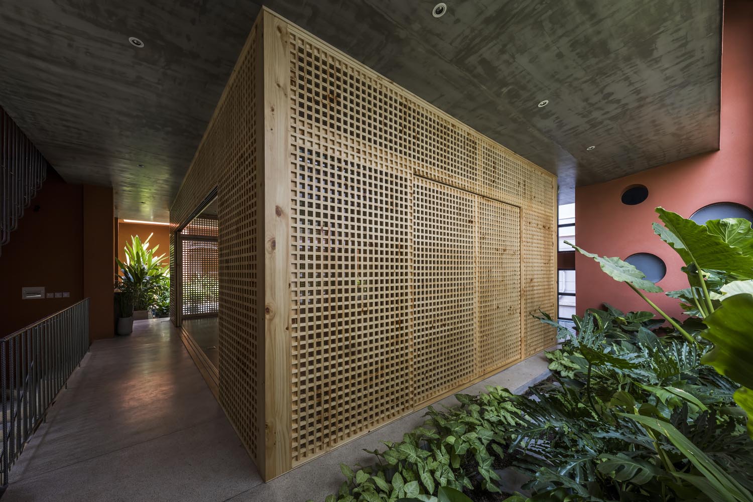 The Red Cave 하우스는 외부 디자인도 그렇지만 외장재, 내부 공간 형태도 베트남 기존 주택들과는 많은 차이를 보인다. 레드빗 외부 컬러는 마을 전체로 넓혀 봐도 쉽게 찾을 수 없는 컬러다. 여기에 주택에서 적용하기 어려운 기둥식 복도는 생활 공간을 더욱 특별하게 만들어 주는 장치다. 요가와 운동 공간인 1층 공간을 이 기둥 복도가 둘러쌓아 공간에 묵직함을 더한다. 이 복도는 형식적으로 공간을 지나는 길이기도 하지만 경계가 없는 외부 공간과 내부 공간을 분리하는 완충적인 기능도 가지는 공간이다. 일종의 중문과 같은 역할을 하는 장치로 심리적으로는 외부에서 내부로 들어올 때 마음가짐을 변화시키는 역할을 기대하는 공간이기도 하다.
